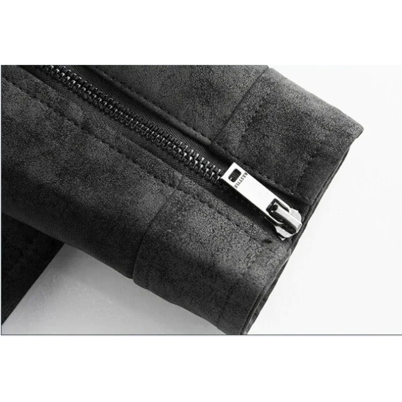 A minimalist moto-inspired jacket crafted from soft leather with a vintage, worn-in character, featuring a stand collar with snap closure, zip cuffs, and streamlined seams for a refined, modern edge.